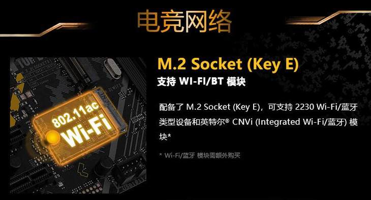 这款主板不仅拥有性能优异的Intel千兆网卡,而且还特别板载了M。2(Key E)接口,支持Type2230型Wi-Fi/蓝牙类型设备,如英特尔CNVi(Integrated Wi-Fi/蓝牙)模块,可实现更顺畅的无线网络连接,干掉延迟,助你尽情施展精湛的操作。此外,它还拥有华硕一系列领军业界的电竞黑科技,支持AURA SYNC神光同步,全方位升级加强,颜值性能俱佳!