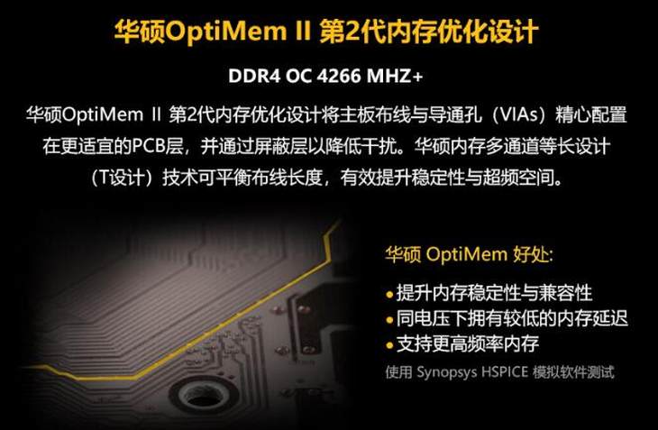 这款主板拥有华硕全新研发的OptiMem II第2代内存优化技术,通过内存的布线与导通孔配置的优化来维持讯号完整性,并加入能大幅降低干扰的屏蔽区域。同时,它还拥有华硕内存多通道等长设计(T设计)技术可平衡布线长度,保持信号传送时间一致,确保主板在双通道内存全插满运作时,可达DDR4 4266+ MHz(O。C)以上的频率,显著提升内存的稳定性和超频空间!此外,还新增第2代内存救援MemOK! II技术,不仅可自动排除内存故障状态,还能让系统尽量保留较高性能设置下顺利开机。