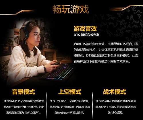 这款主板拥有高品质音频芯片,能够提供身临其境的游戏音效体验。特别是DTS游戏音效定制技术,这是华硕携手DTS联合开发的游戏音效技术,为立体声耳机提供多声道环绕虚拟化。让玩家可根据游戏类型,将音效偏好设为上空模式(适合MOBA/RTS/策略/运动游戏),音景模式(适合 MMO/RPG/动作冒险/恐怖游戏)和战术模式(适合 FPS/潜入类游戏),进而带给玩家更逼真、更震撼的游戏音效以及更精准的声音定位。